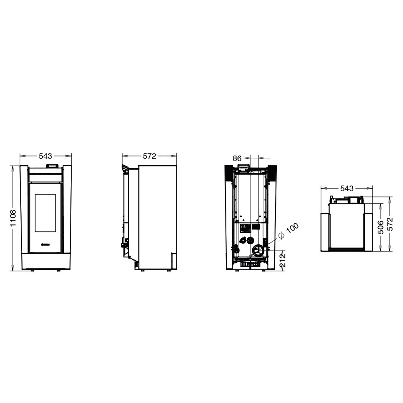 - Abgasstutzen Ø 100 mm oben; externe Luftzufuhr vorbereitet.